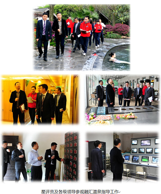 三位星评员和旅游局领导们随即参观了融汇温泉的营业区域,严格按照《温泉企业服务质量等级划分与评定》(LB/T016-2011)的标准进行现场检查评定。从服务品质、现场管理、设备设施和安全操作方面严格检查、悉心指导,通过检查和谈访,既感受到融汇温泉在硬件建设和经营管理方面有诸多独到的特色和创新,也对融汇温泉在经营理念、管理体制、综合开发能力和温泉产品创新能力、温泉项目经营管理方面所做的努力和成绩予以高度认可。