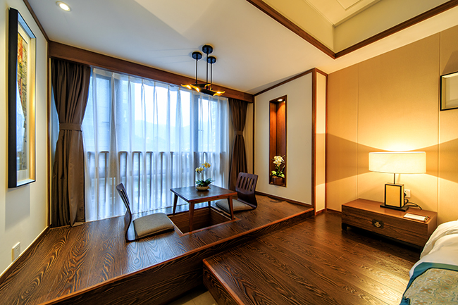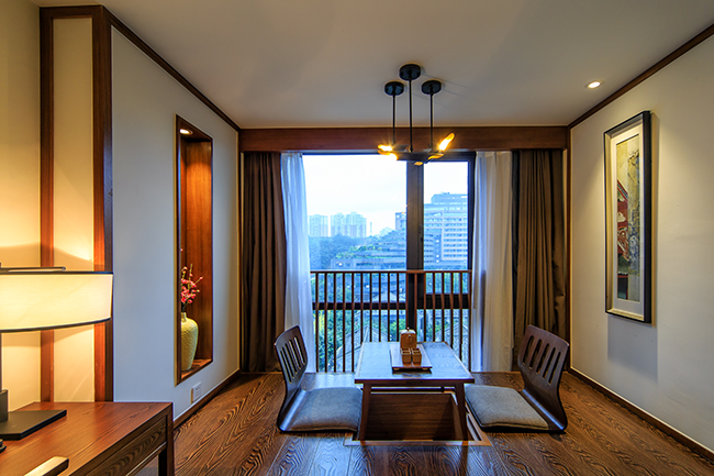 客房内部装饰淡雅节制,却不失沉稳高贵之感,深邃禅意的氛围,突显出清新自然、简洁淡泊的独特品味。客房内配备有一间接待客厅与一间宽敞舒适的卧房,为您打造出悠然自得的居停空间;另配有典雅的品茶区、麻将机,随时满足您的休闲需求;复古榻榻米,采用人体工程设计,贴服舒适,床品均采用可媲美五星级酒店的同类产品,让您即刻享受到家的温暖。
